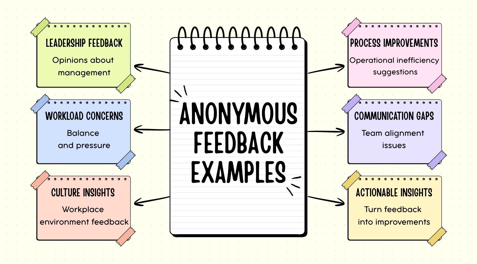 - Anonymous feedback examples show how employees share honest opinions about leadership, workload, culture, policies, and workplace improvements.