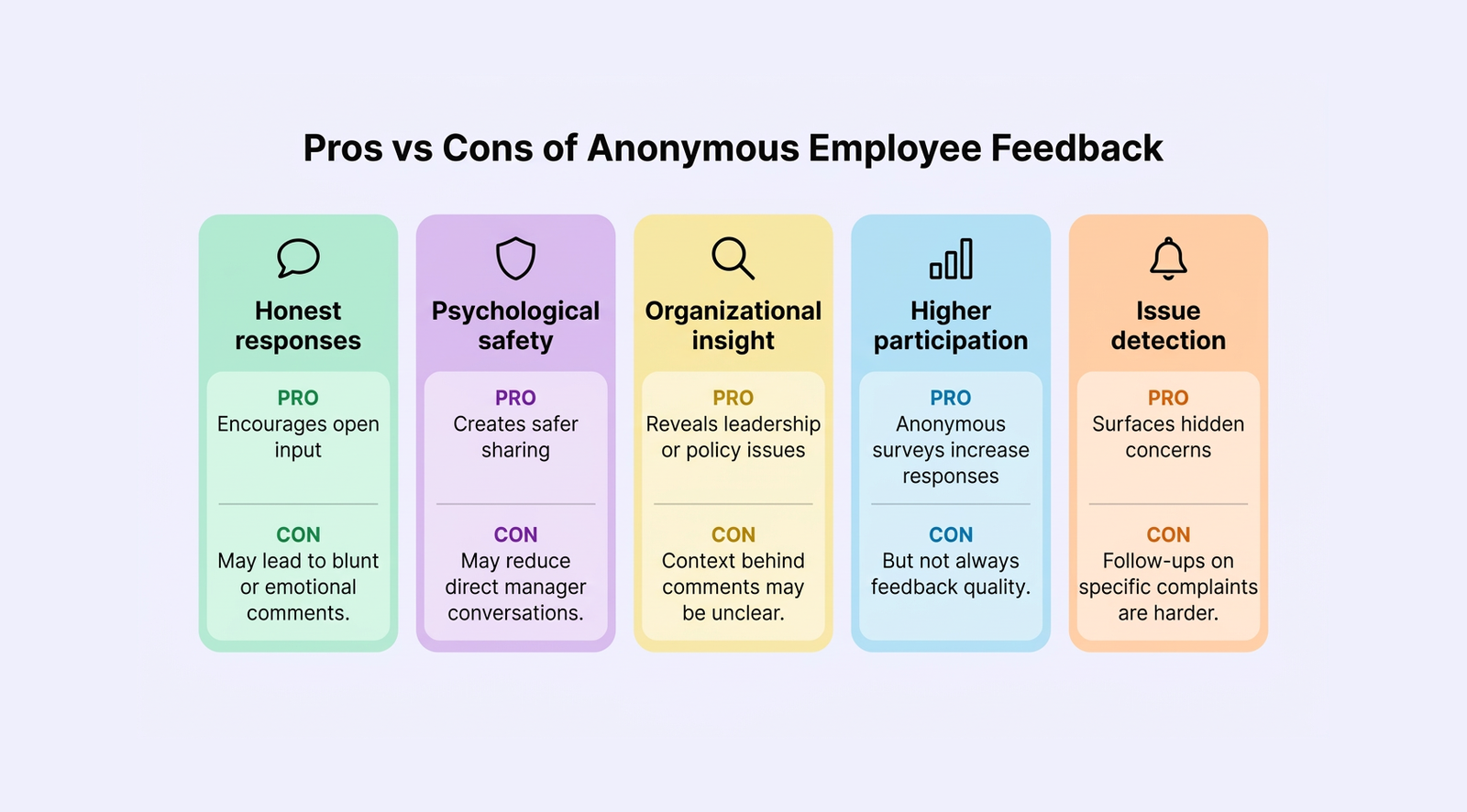 | Aspect | Pros of anonymous employee feedback | Cons of anonymous employee feedback |